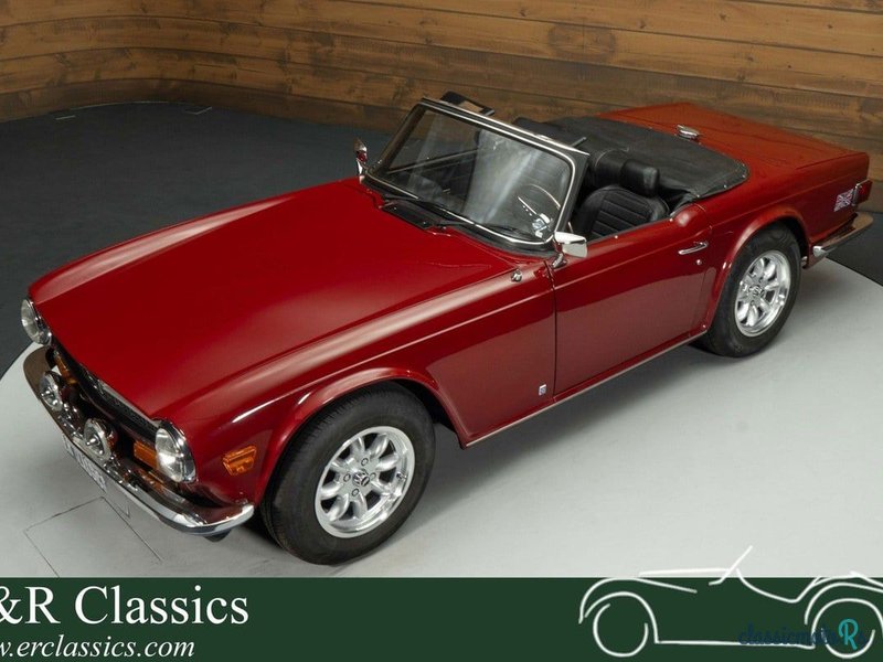 ** Triumph TR6 | Restored | Overdrive | Carmine Red | 1974**** Highlights:****\- Restored** **\- 23 years with one owner** **\- Overdrive** **\- 2. 6-litre 6-cylinder engine** **\- Carmine Red paint**** Restored Triumph TR6 for sale with overdrive** The 1974 Triumph TR6 is one of the most beloved British roadsters ever built. This particular TR6 features the powerful 2. 6-litre 6-cylinder engine, paired with a manual gearbox and overdrive for comfortable cruising. Known for its robust engineering and timeless lines, the TR6 was praised in its day as the ultimate driver’s car. This car has been restored in the past and has been in the possession of a single owner for no less than 23 years – a testament to the care and affection it received. Its combination of history, engineering, and care makes this TR6 a true collector’s item.** Triumph TR6 in Carmine Red for sale** This Triumph exudes pure British class. The Carmine Red paintwork shines beautifully in combination with the Minilite-style wheels and additional driving lights at the front – details that emphasise its sporty character. The black soft top and matching cover give the car a classic, well-kept look. Inside, you’ll find a stylish interior with black-upholstered seats, a wooden dashboard, and an Astrali sports steering wheel that fits perfectly in your hands. The warm wood tones contrast elegantly with the red body and black interior, making every drive feel like a journey through time. Our sales team is happy to answer your questions or even create a personal shop video just for you.We can help with transport. Within Europe you do not need to pay any import duties. Trading in, buying and consignment possible. In some countries we can help with financing. Ask our sales staff.