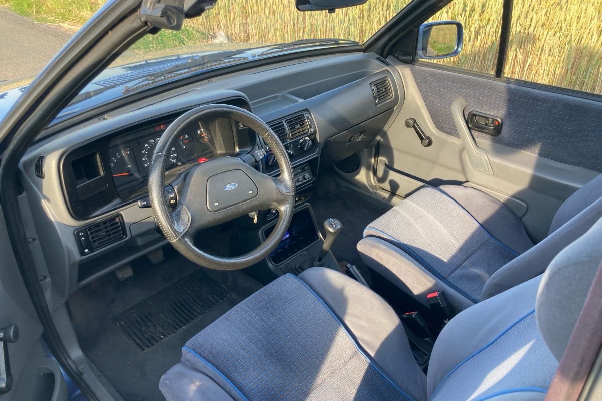 L’avantage de cette voiture est qu’elle est assez spacieuse pour accueillir 4 adultes et que son coffre est vaste, ce qui est idéal pour partir en vacances ! Par contre, même si la XR3i cabriolet était la version la plus chic de l’Escort, il ne faut pas s’attendre à trouver un habitacle luxueux. On reste bien dans les standards de Ford dans les années 80 avec une planche de bord assez minimaliste composée de plastiques durs (heureusement très bien conservés dans la voiture de Luc !), des sièges en velours très « populuxe », des vitres et une capote manuelles et une radiocassette avec un petit logo Ford.