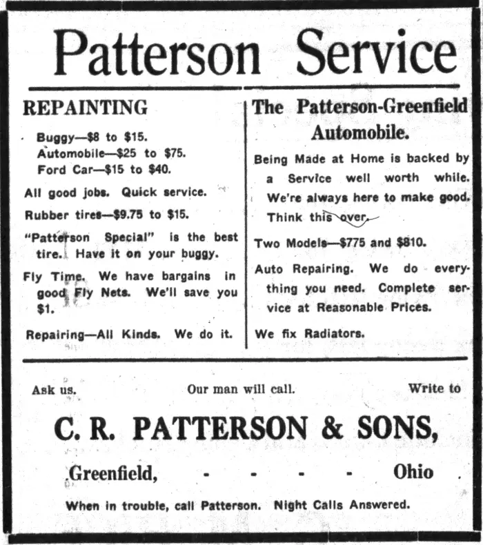 In 1910, C.R. died, and his son Frederick took his place atop the company. It was a time when car ownership was exploding thanks to Henry Ford’s Model T. The year before, there was one car for every 65,000 people. Now, there was one for every 800 people, and automobile servicing had become a side business for Patterson. The company had considered building cars as early as 1902, but it was C.R.’s company at the time, and he was not interested in such a venture.