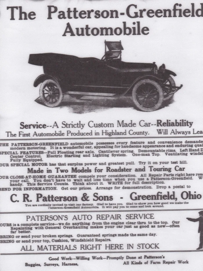 The resulting car, the Patterson-Greenfield, used off-the-shelf parts like many smaller automakers of the time. They bought the steel frame, cantilever springs, rear axle, demountable rims, electric starter, electric lighting, and a ventilated windshield.