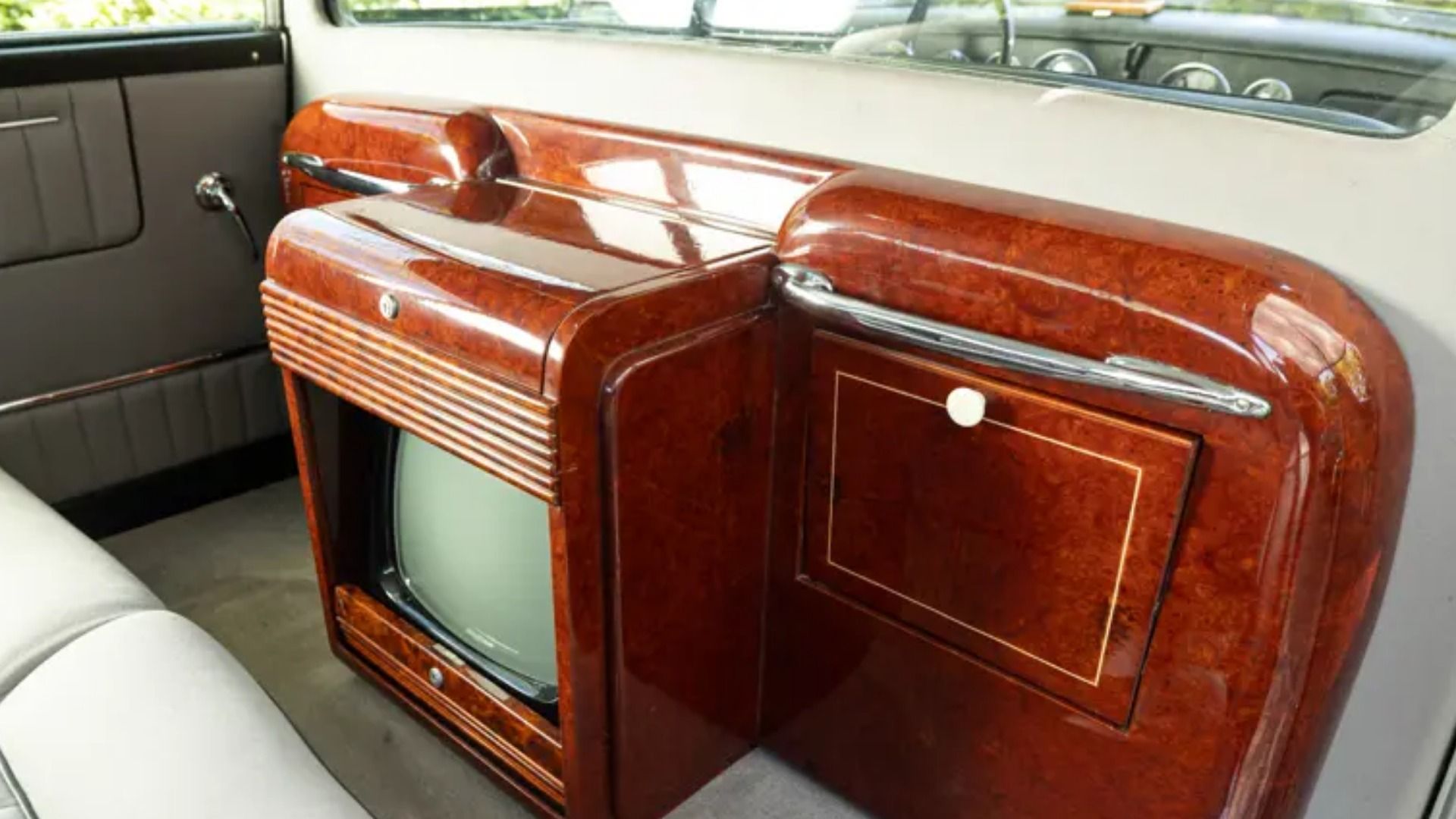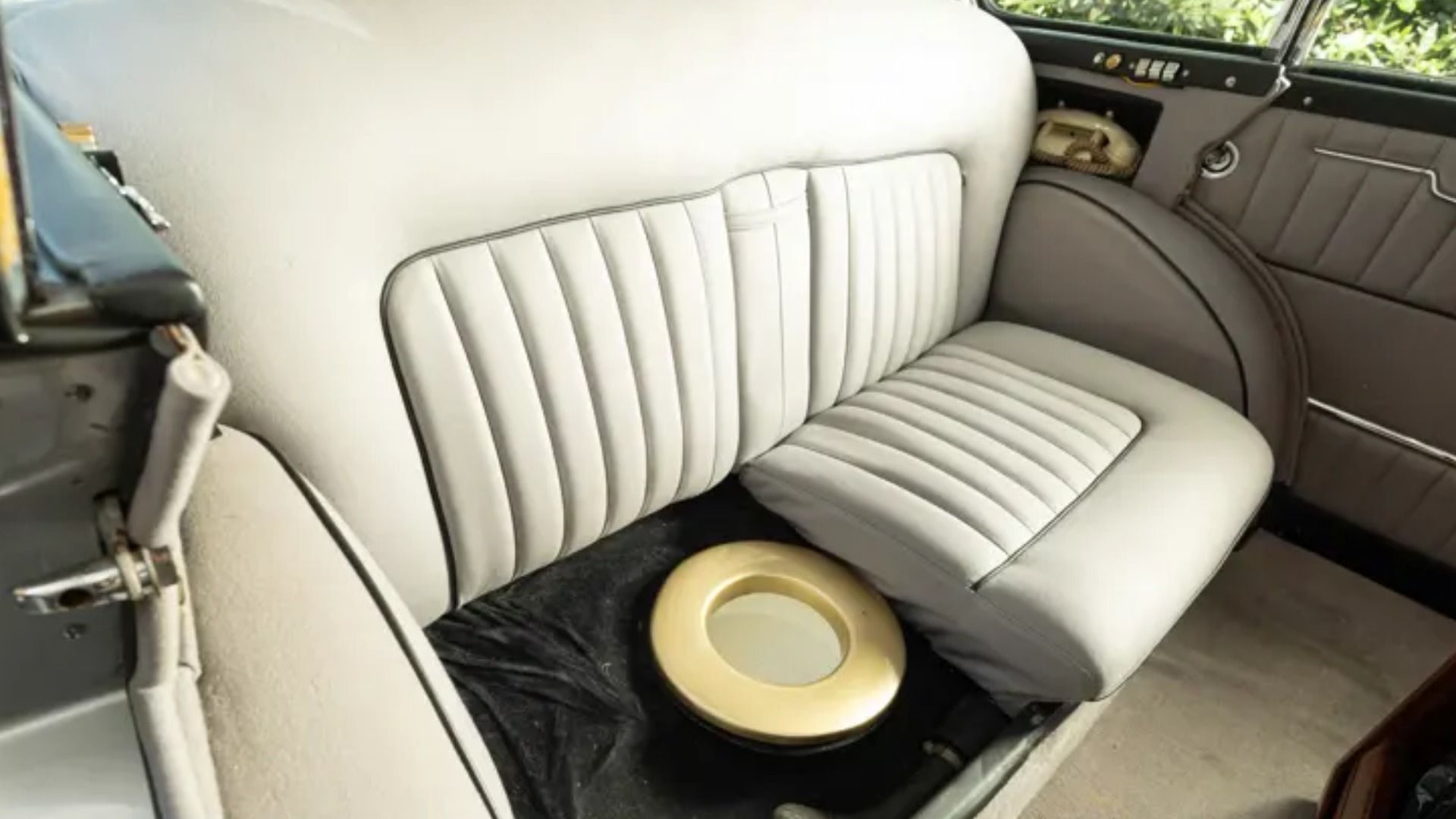 Inside the bespoke Silver Wraith is a telephone package for the rear passenger, a gold-plated champagne cooler under the seating, a television in the rear row, and contrasted black leather front seating and gray rear seating. Both rows feature lovely wood inlays and fold-down armrests in the seats. It's a fairly tasteful interior, well-matched with a bright silver exterior paint job and white-wall tires.