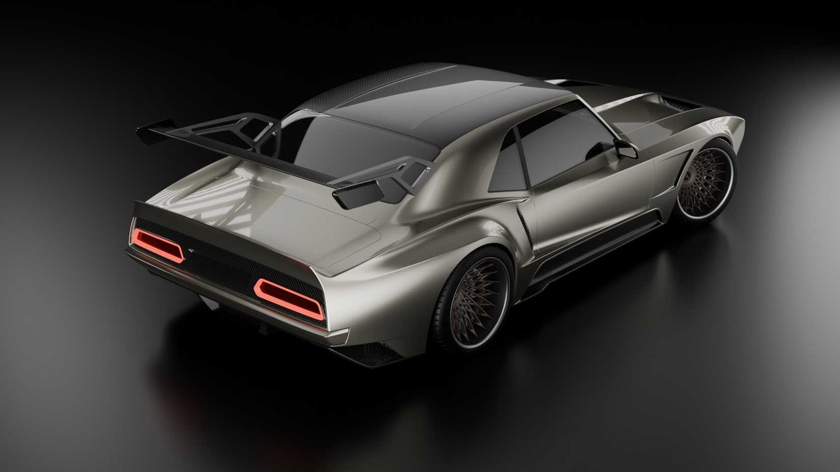 The renderings of the car are as extreme as the powertrain would suggest. An almost cartoonishly low Camaro with massive wheels, a pulled-back cabin, and a wing that would make a Superbird blush. The carbon fiber panels were designed by Sean Smith, a designer who has penned cars for Ringbrothers, Kevin Hart, and did the mid-engined Charger from Fast 9.