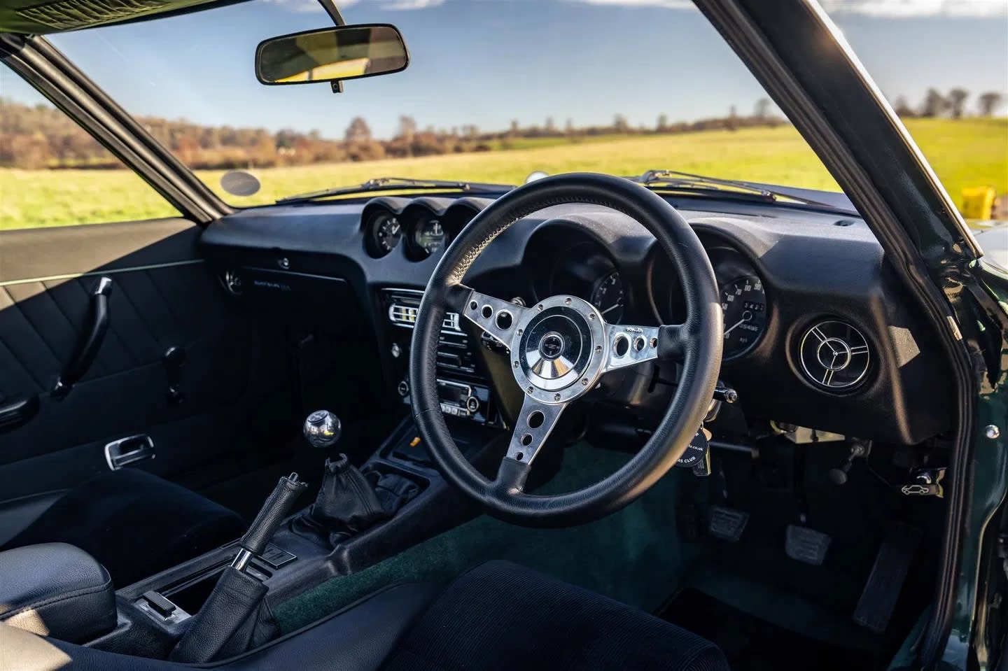 It all starts with a clean 1973 shell from California, professionally converted to right-hand drive using genuine Nissan parts. The team stripped it down to bare metal, seam-sealed everything, and finished it in a custom color called MZR Heritage Green (not British Racing Green). The look is nothing showy and true to the era. Re-chromed bumpers, rare factory headlamp covers, and restored mirrors round out the exterior, keeping things authentic without going overboard.