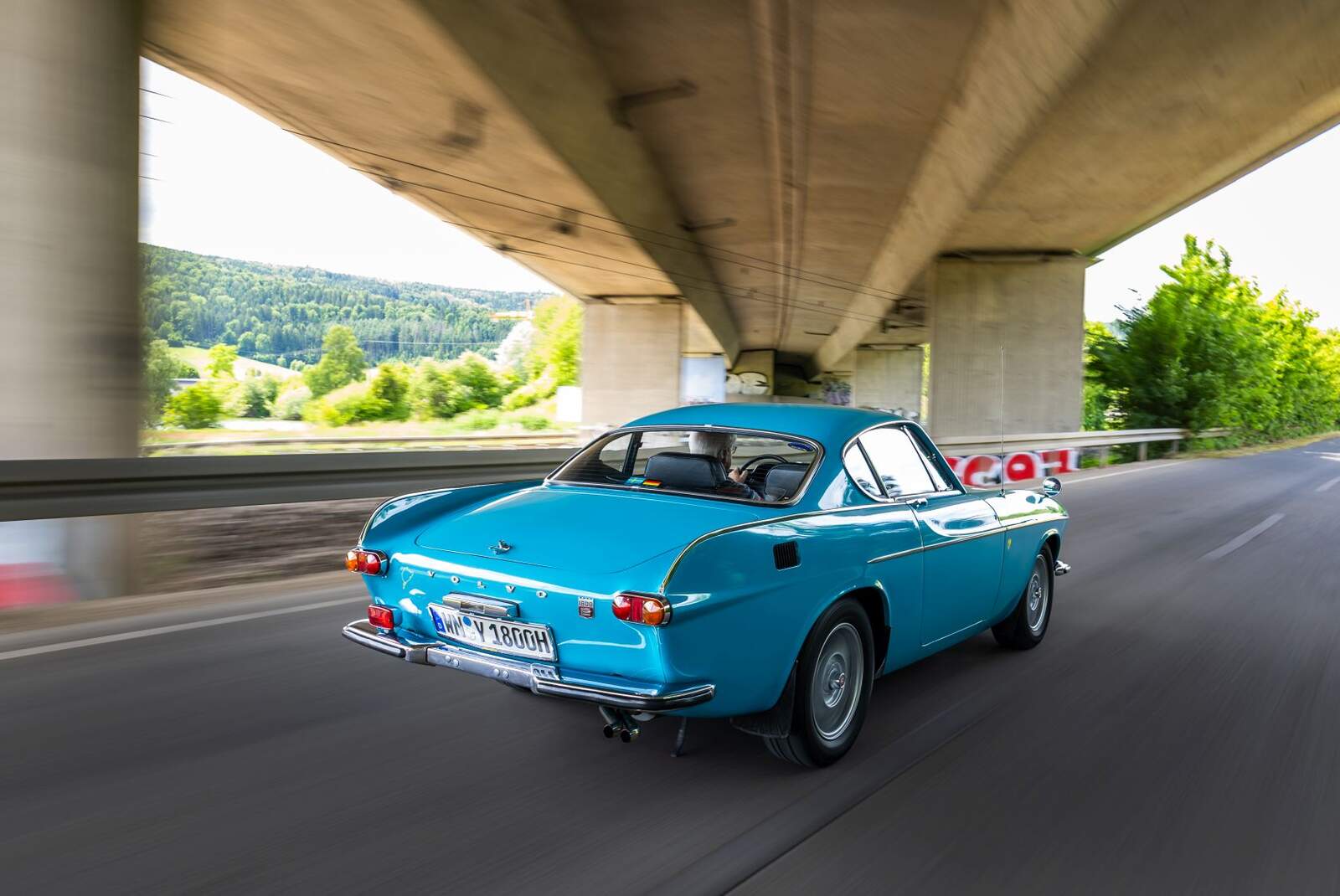 Wunderbar original steht er da, brummig, warm und leicht heiser. Der B20E-Vierzylinder wartet im Leerlauf darauf, dass wir ihn zur Rundfahrt ins Remstal ausführen. Er ist die nächste Ausbaustufe des B18 – immer noch mit stirnradgetriebener Nockenwelle, aber nun mit zwei Litern Hubraum und 124 statt der 105 PS im letzten P1800 S. Nachdem man zunächst genügend Kraft aufgebracht hat, das Coupé ohne Servolenkung aus seiner Halle zu zirkeln, nimmt es Kurs auf die Landstraße – und der herrliche Vierzylinder flüstert mit betörend bassiger, leicht kratziger Stimme all seine Kaufargumente ins Ohr.
