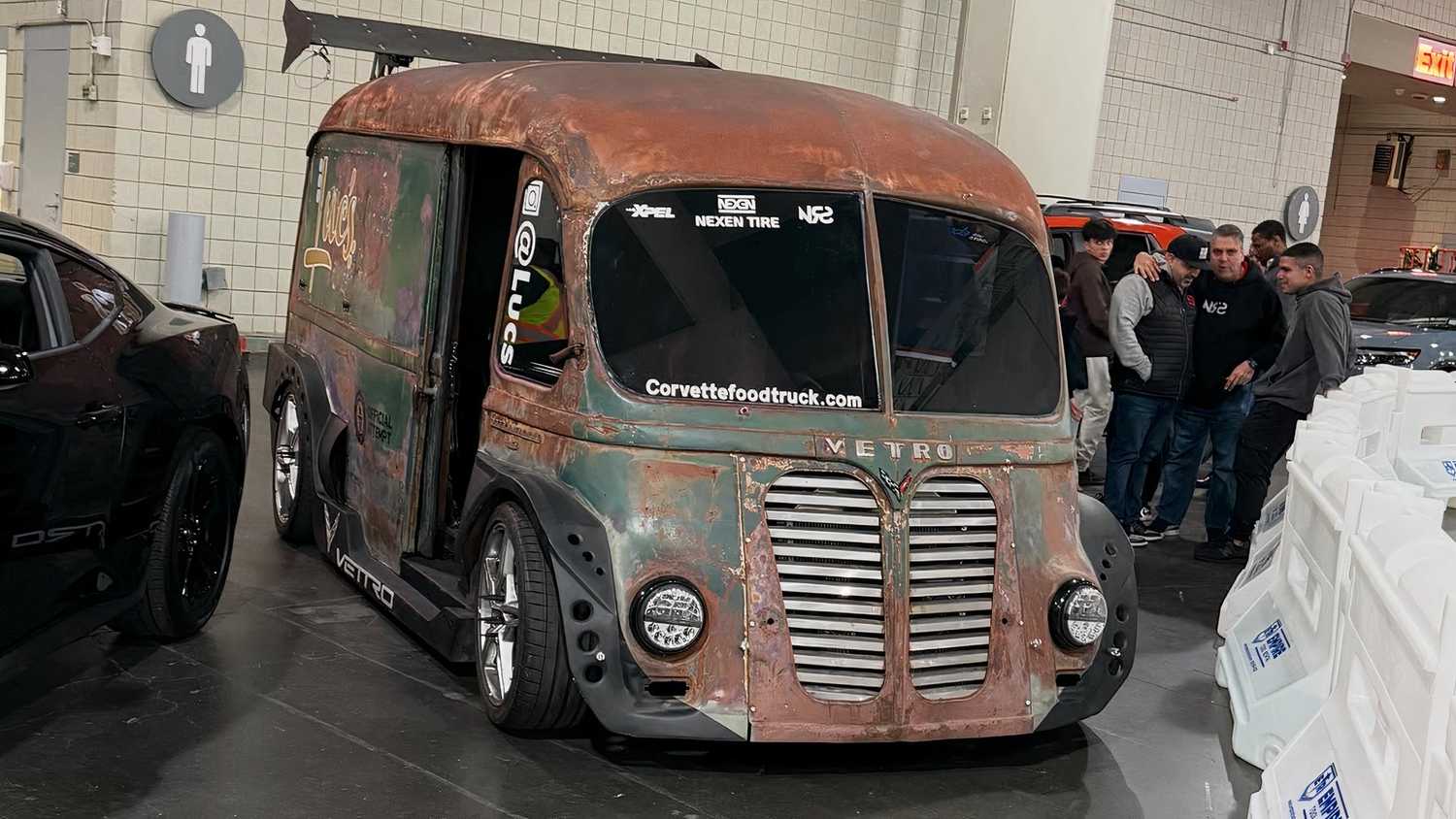 Looking closer at the Vettro, the classic van part has been upgraded with LED headlights, flared wheel arches, custom-fabricated side skirts, and a rear spoiler. It's the five-spoke alloy wheels that let you know what's lurking underneath. A standard Corvette has a top speed of 194 mph, but the International-Harvester Metro van has all the aerodynamic qualities of a loaf of bread. A target of 130 mph doesn't seem unrealistic to us, although it will take some fortitude and perhaps a little skill to hold it there if it's a breezy day.