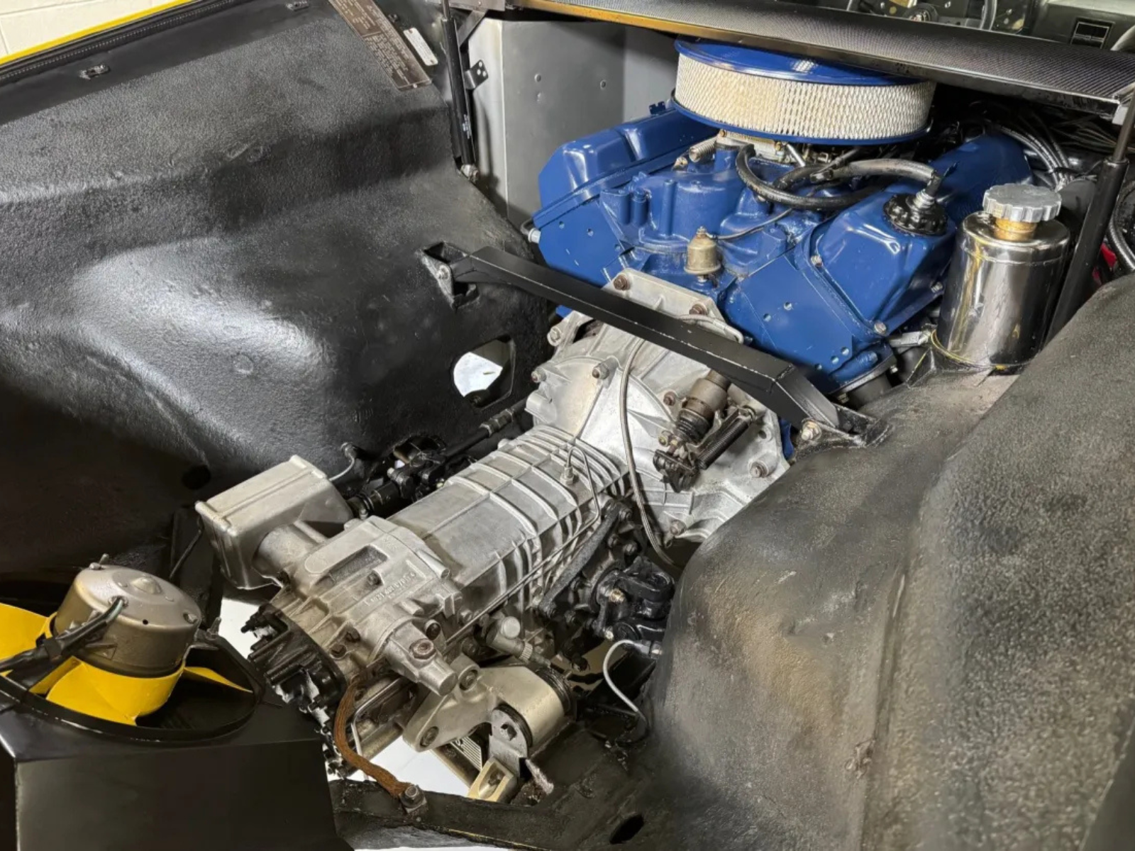 The mid-mounted Cleveland V8 was rebuilt by Cobra Automotive of Connecticut in 2023, with the cylinders bored 0.030 inches over and static compression raised to a claimed 11.2:1 through the use of aftermarket internals such as Sportsman flat-top pistons. Output figures were not disclosed, though power is sent to the rear wheels through a ZF five-speed manual transaxle.
