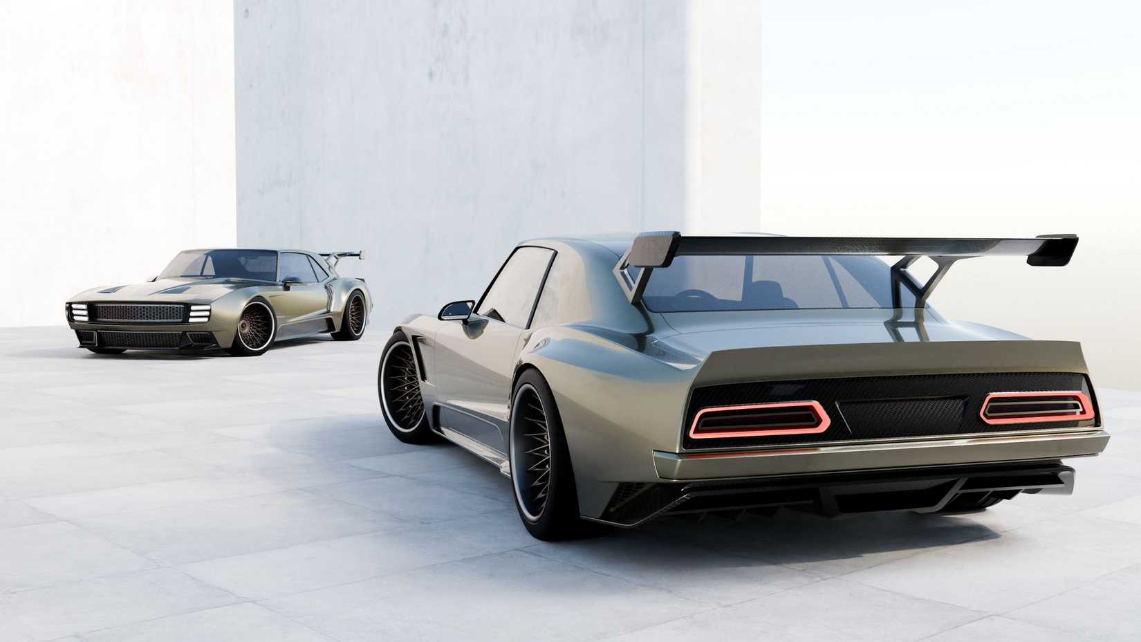The renderings of the car are as extreme as the powertrain would suggest. An almost cartoonishly low Camaro with massive wheels, a pulled-back cabin, and a wing that would make a Superbird blush. The carbon fiber panels were designed by Sean Smith, a designer who has penned cars for Ringbrothers, Kevin Hart, and did the mid-engined Charger from Fast 9.