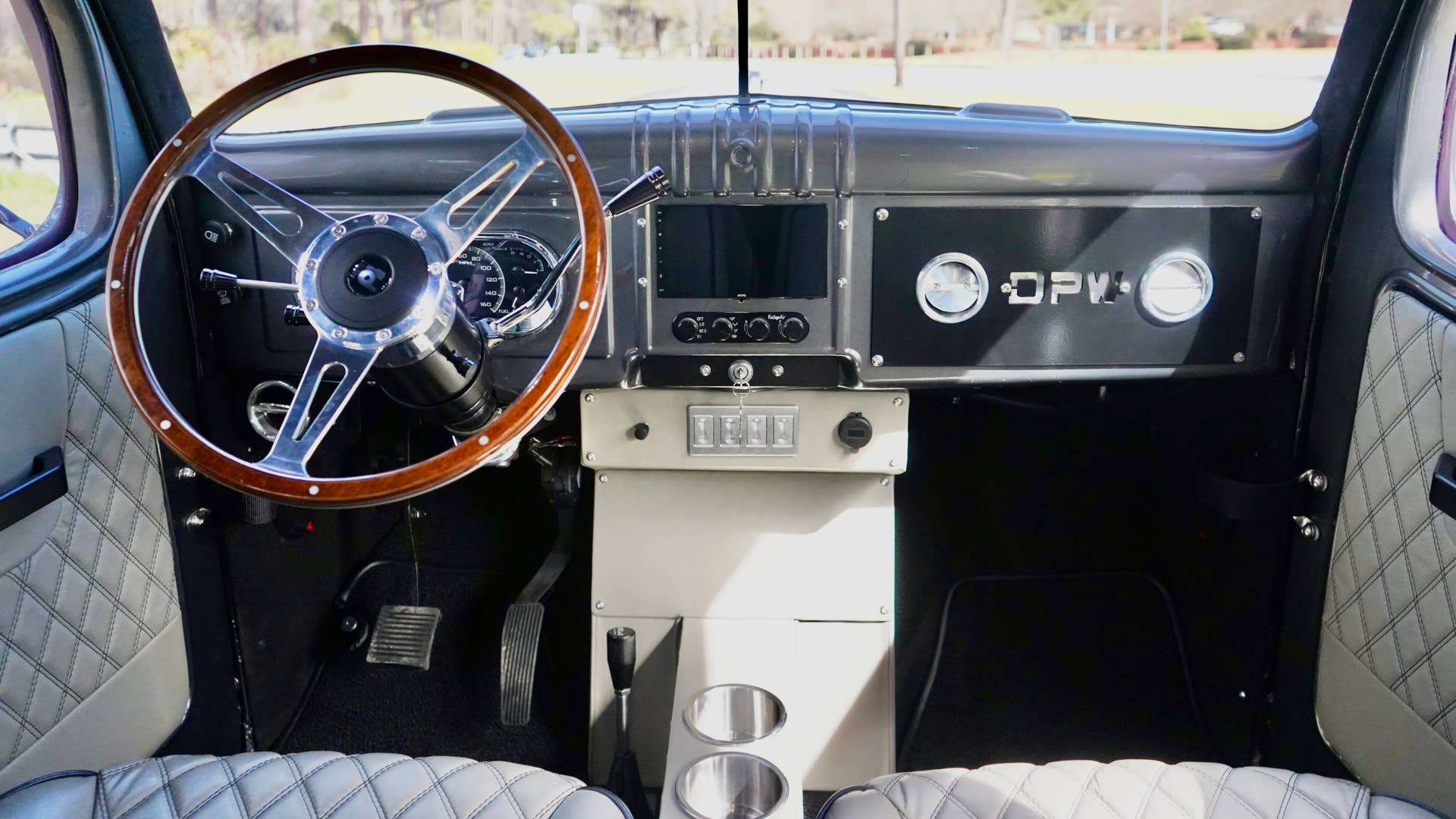 The classic metal dashboard is brought into the modern age courtesy of the Dakota Digital VHX analog gauges, Atoto infotainment system with Apple CarPlay and Android Auto, and the JL Audio / Rockford Fosgate sound system.