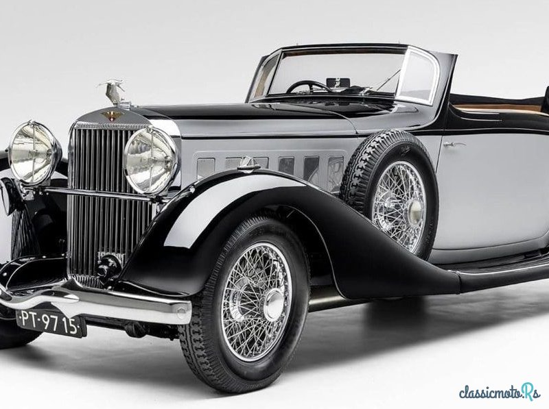 Оснащенный легендарным двигателем Hispano Suiza V12 объемом 9,4 литра, который ранее был полностью восстановлен, работает прекрасно. • Регистрация: ранее Калифорния HV8895 и Голландия PT-97-15. Налоги ЕЭК уплачены • Номер шасси: 13033 • Номер двигателя: 321113. Просто великолепное, величественное и роскошное воплощение одного из лучших автомобилей, которые можно было купить за деньги в 1930-х годах. Этот Hispano Suiza был заказан в 1934 году доктором Моллом Ван Шаранте и отправлен в Д'Итеран для установки кузова кабриолета, который мы видим на автомобиле сегодня. Спрятанный во время военных действий во время Второй мировой войны, он был после войны продан доктору Э. П. Ринку из больницы Wll. Впоследствии он попал в США, где находился в собственности Уильяма Бердена и его потомков. Автомобиль оснащен легендарным двигателем Hispano Suiza V12 объемом 9,4 литра, который после полной реконструкции ранее работал прекрасно. Двигатель имеет одинаковый диаметр цилиндра и ход поршня, что придает ему редкую квадратную конфигурацию в отличие от более распространенной конфигурации с длинным ходом, используемой в других марках для снижения налоговых сборов. Очевидно, что это были автомобили, произведенные за деньги, а не для клиентов-объектов. Из четырех доступных вариантов шасси для этого автомобиля было выбрано второе самое короткое из четырех с колесной базой 146 дюймов, причем более длинные версии обычно предназначены для лимузинов. Кузов от D'Iteran представляет собой шедевр пропорций, выглядит одновременно изящно и стильно, маскируя при этом свет огромных размеров автомобиля. Цена шасси в то время составляла около 200 000 франков, независимо от заказанного размера шасси. Оригинальный талисман аиста от Франсуа Базен украшает верхнюю часть радиатора. Этот автомобиль подвергался полной реставрации в США с отливкой новых поршней с нуля и т. д. Сейчас автомобиль находится в очень-очень аккуратном состоянии, хотя с очень легкой патиной на чудесном кожаном салоне и т. д. Этот автомобиль просторный, вмещает до 6 человек. Задняя часть особенно просторна: огромное пространство для ног и отдельное ветровое стекло обеспечивают защиту задних пассажиров.