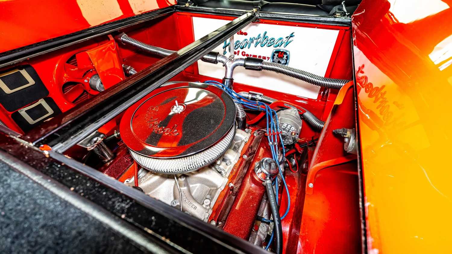 With dual radiators positioned alongside the rear-mounted engine with a full custom frame with 2x4 steel rails, the red and black VW Bus has been widened by six inches at the back to accommodate the massive mill and its cooling systems. Of note, the rear end was borrowed from a Cadillac Eldorado, one of the greatest Cadillacs of all time.